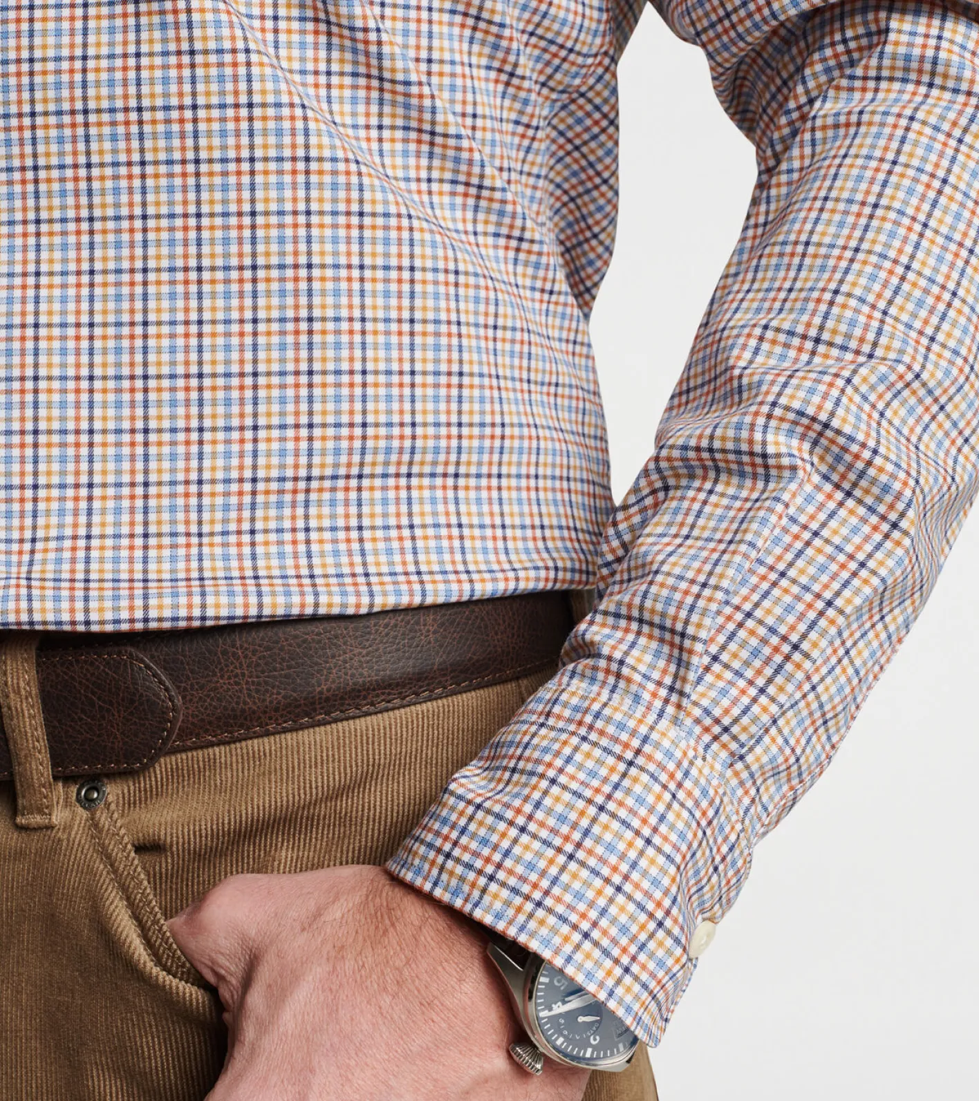 - Button-down collar, French placket, double-button barrel cuffs