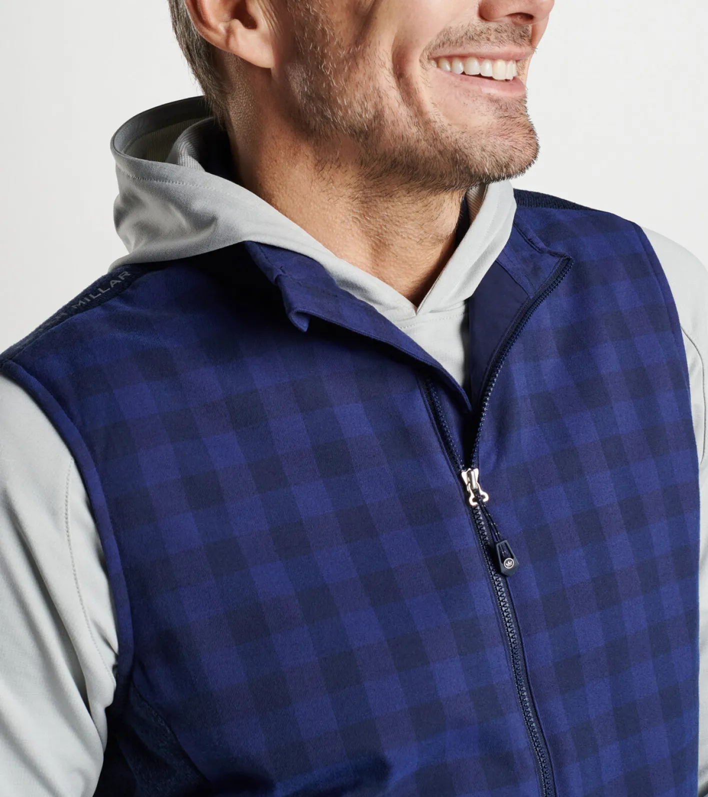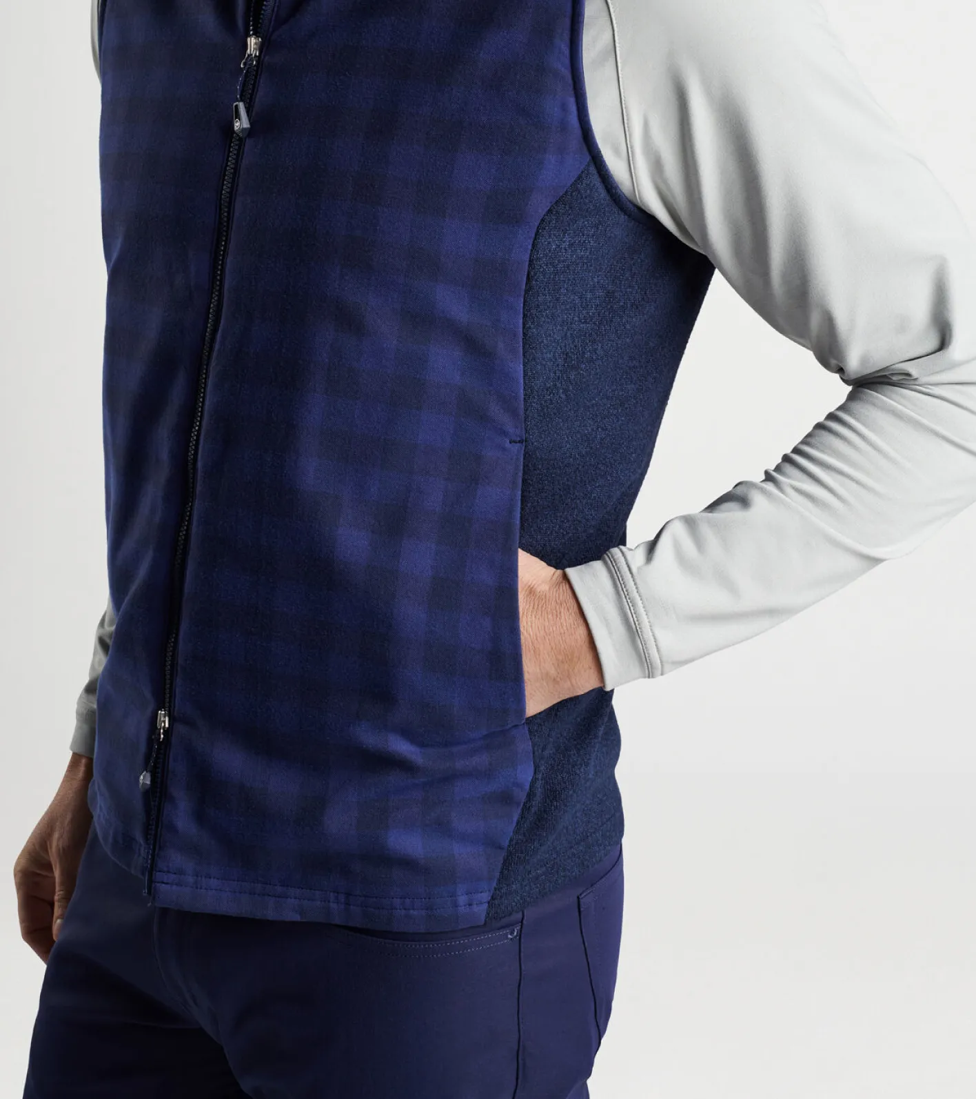 This lightweight performance vest features an insulated wind and water-resistant flannel front panel for protection from the elements and a four-way stretch knit back for unrivaled mobility. Featured in a classic tone-on-tone plaid and finished with a two-way zip closure and handwarmer pockets.