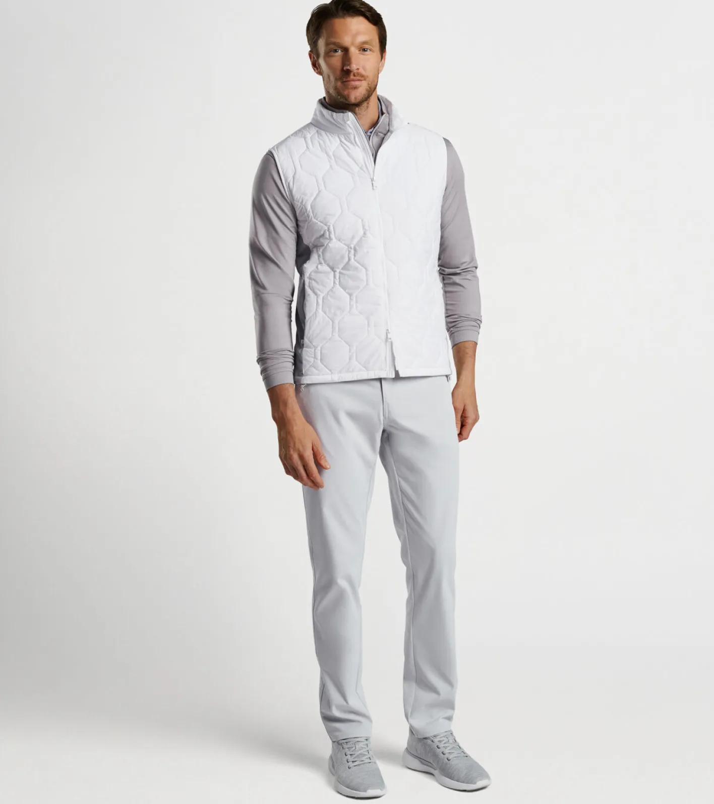The new Blitz vest is blends classic looks and technical know-how for on and off-the course. A hexagonal quilted front and contrast stretch back panel offer lightweight insulation and unrestricted mobility in this wind and water-resistant design. Finished with a two-way zipper and two side zip pockets.