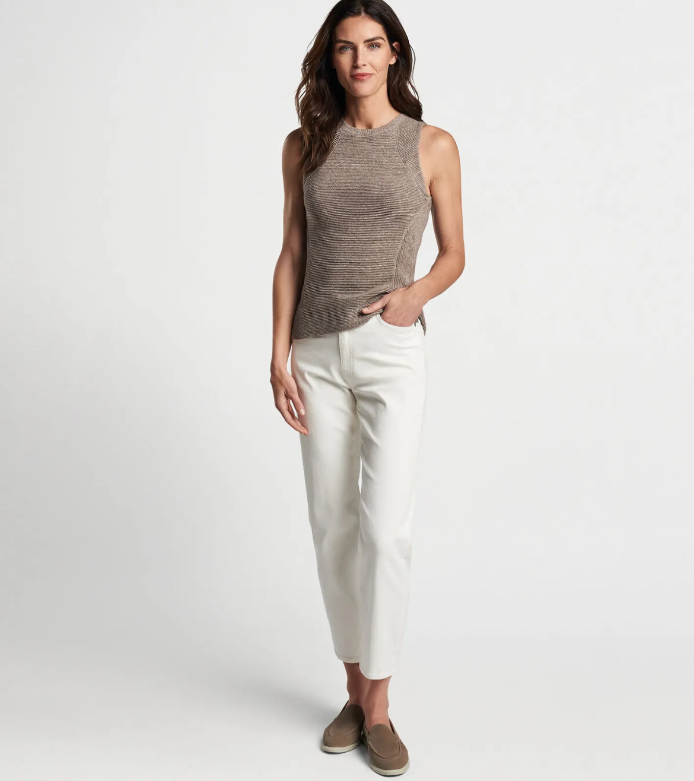 Elevate your spring and summer style with this sleeveless sweater. It’s crafted from a lightweight wool and linen blend that’s ultra-soft and breathable. The knit features directional variation for a distinctive aesthetic, while an ottoman rib provides a touch of texture. Fitted to the body with side vents at the hip, it’s a flattering, comfortable essential.