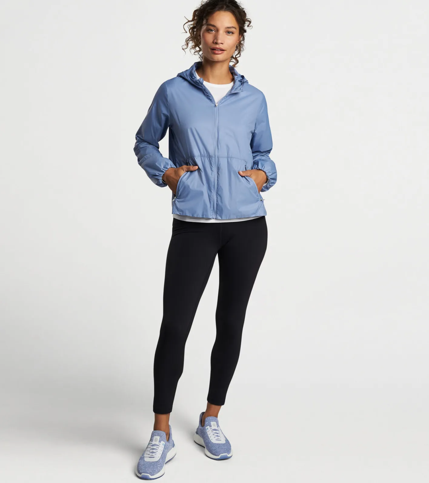 This lightweight windbreaker offers wind-and-water resistance in a chic silhouette. It’s designed with a vented hip that provides room for layering, as well as gathered cuffs for a clean look. It features a ripstop fabric and a built in hood bill perfect for blustery days.