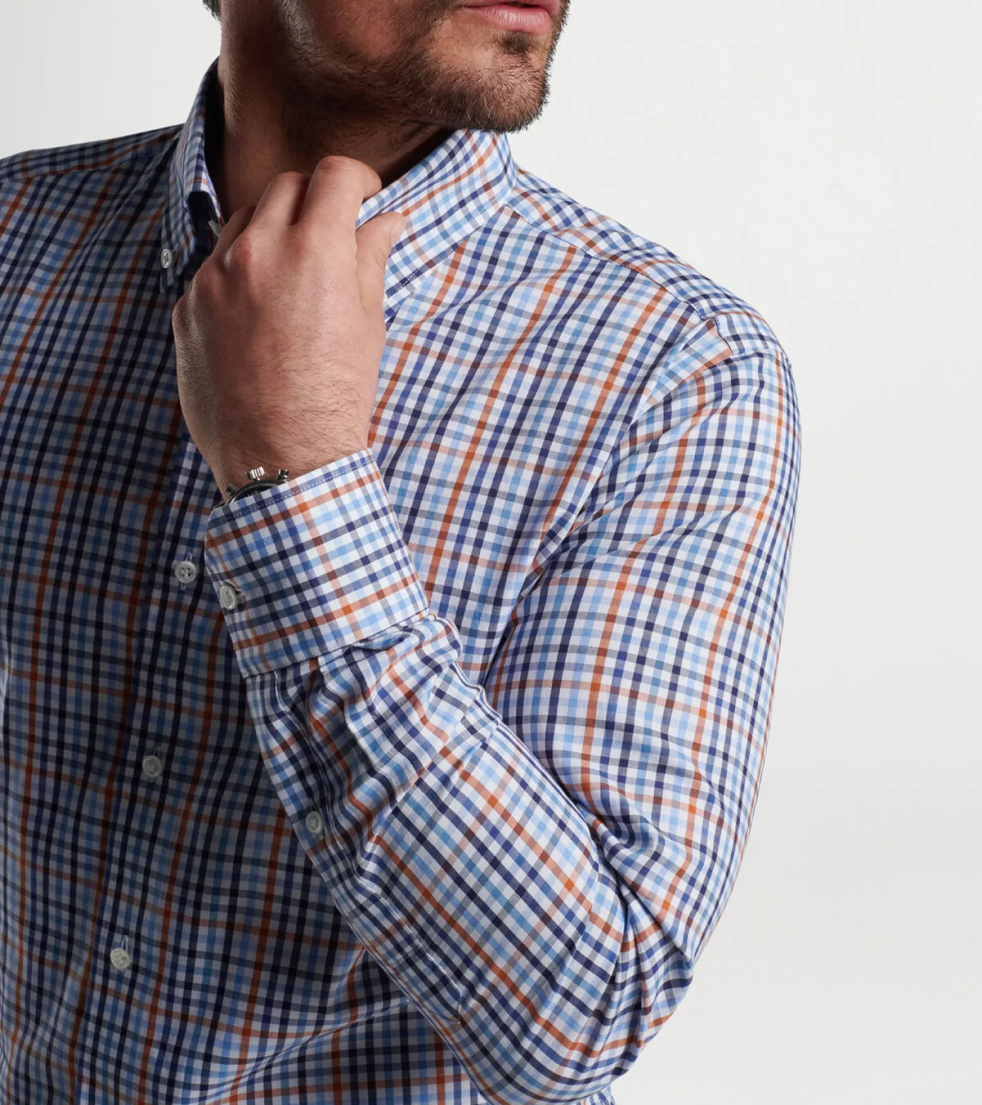 This sophisticated sport shirt is made from an incredibly soft cotton with our signature Flex Finish. This special treatment allows for incredible stretch mobility without the use of synthetic fibers. Finished with a button-down collar, French placket and mitered cuffs.