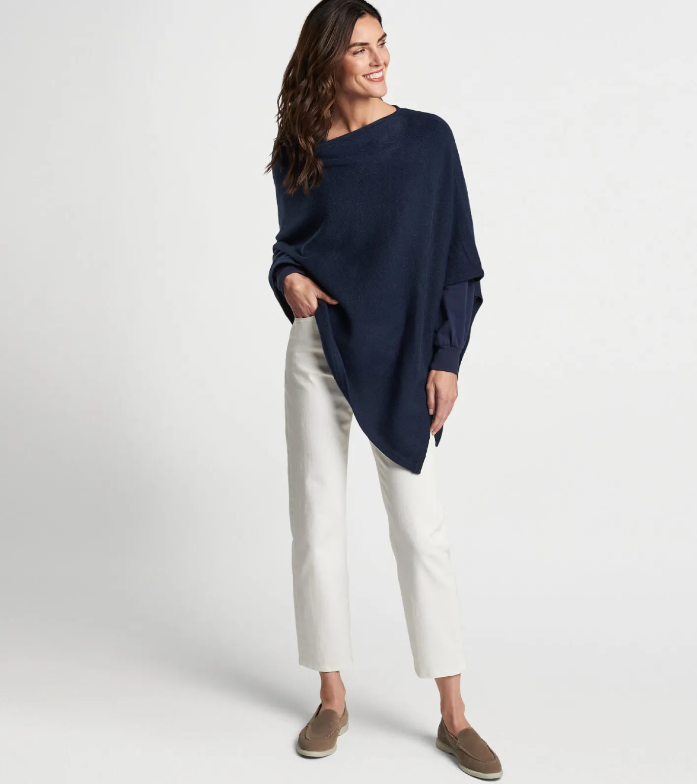 This elegant poncho, made from luxurious cashmere, is an ultra-practical layer for the changing seasons. An asymmetrical drape makes it easy to style and layer over other garments. Worn as an alternative to light jackets and coats, it fits in beautifully in both formal and casual settings.