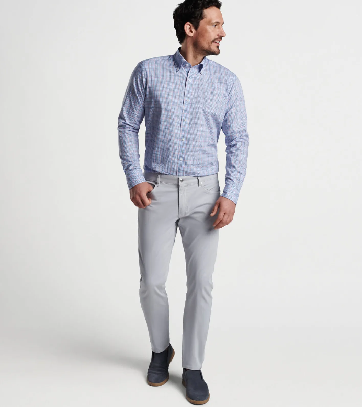 This refined sport shirt is fashioned from 100% cotton twill expertly woven in Northern Italy. It features our signature Flex Finish—a special process that infuses the shirt with stretch properties without the use of synthetic fibers. It’s detailed with a button-down collar, French placket, mother-of-pearl buttons and mitered cuffs.