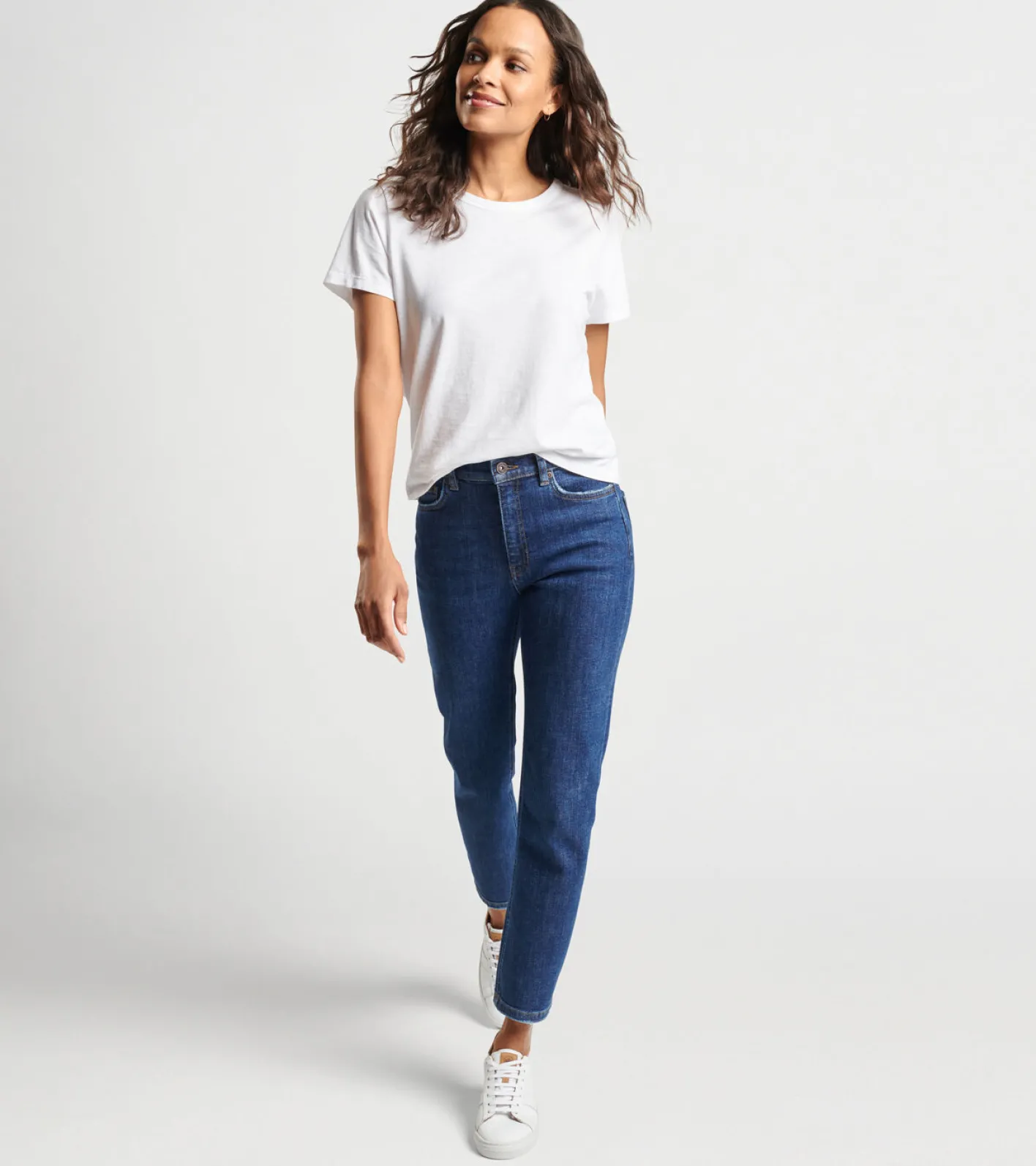 This denim features a high-rise waist, straight leg-opening and two true indigo washes for classic casual style. Designed with ideal stretch, and styled to hit just above the ankle, these jeans are available with a 27 or 29 inch inseam.