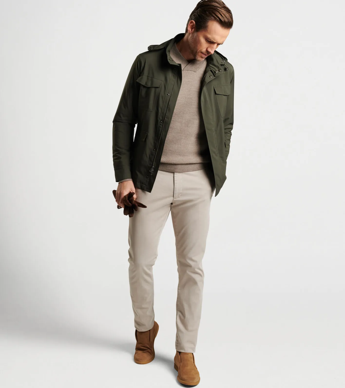 An icon of luxury innovation, our timeless safari jacket is crafted from a specially engineered Italian fabric that’s wind and water-resistant with natural stretch. A wrinkle-resistant, packable design incorporating a wide range of pockets makes it perfect for travel, while a low-profile hood can be rolled into a zippered pouch along the neckline.