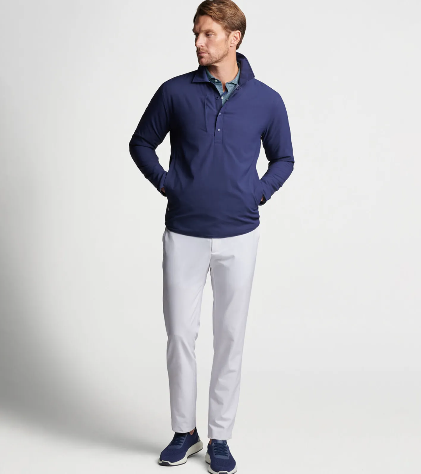 A lightly insulated, breathable midweight layer for transitional temperatures on and off the course, designed in an extremely versatile, singularly stylish pullover. It’s crafted from an incredibly soft performance fabric that features water resistance and four-way stretch. Finished with a cutaway shirt collar, chest zip pocket, side-entry bottom pockets and a half-snap closure.