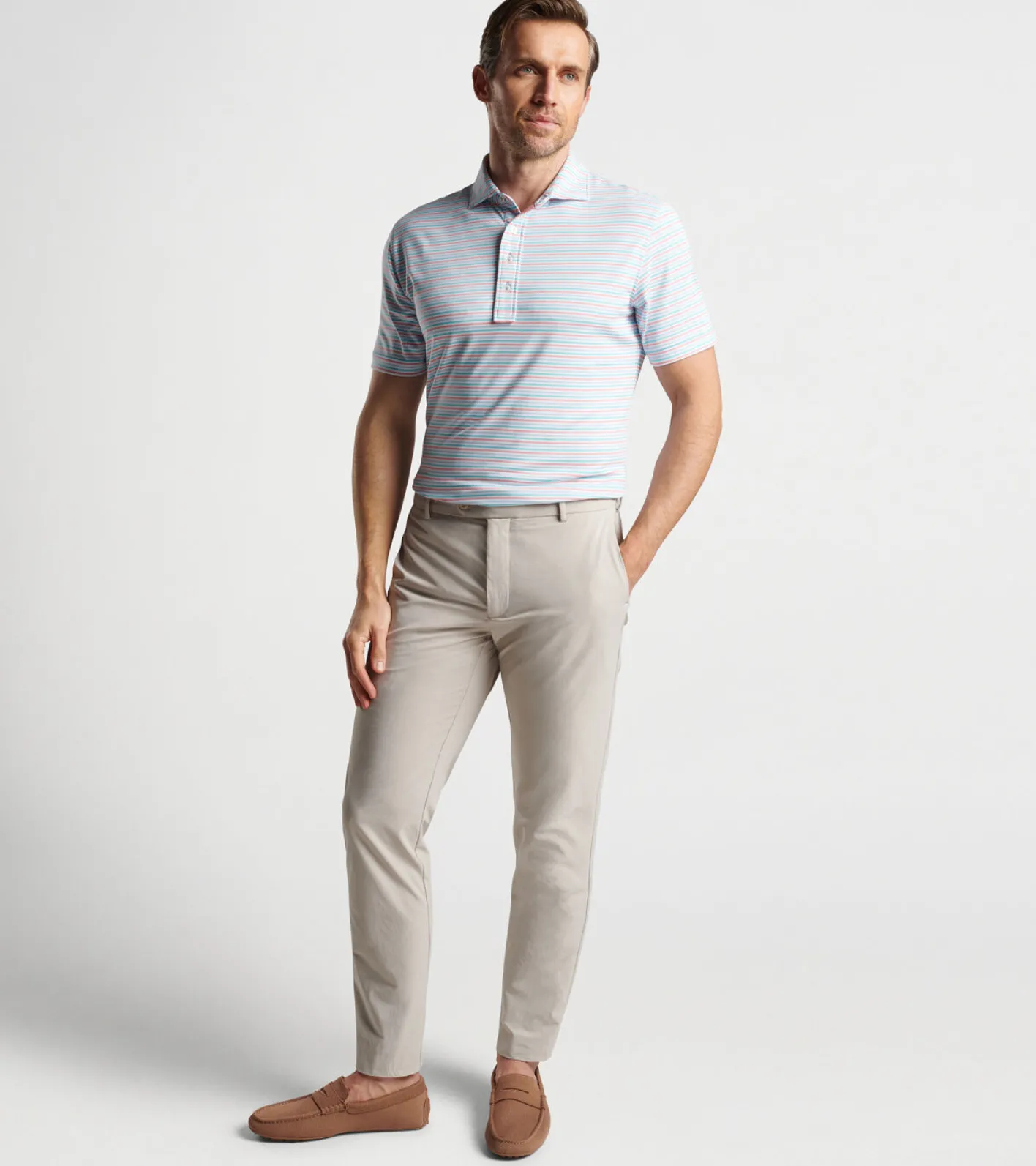 Our Crown Crafted performance polos are designed for and elevated perspective on technical sportswear. They’re made from a rounder, smoother yarn than traditional golf polos for a distinctly soft feel and stretch mobility. This polo is finished with a Kelly Hard Collar, a four-button placket and mother-of-pearl buttons.