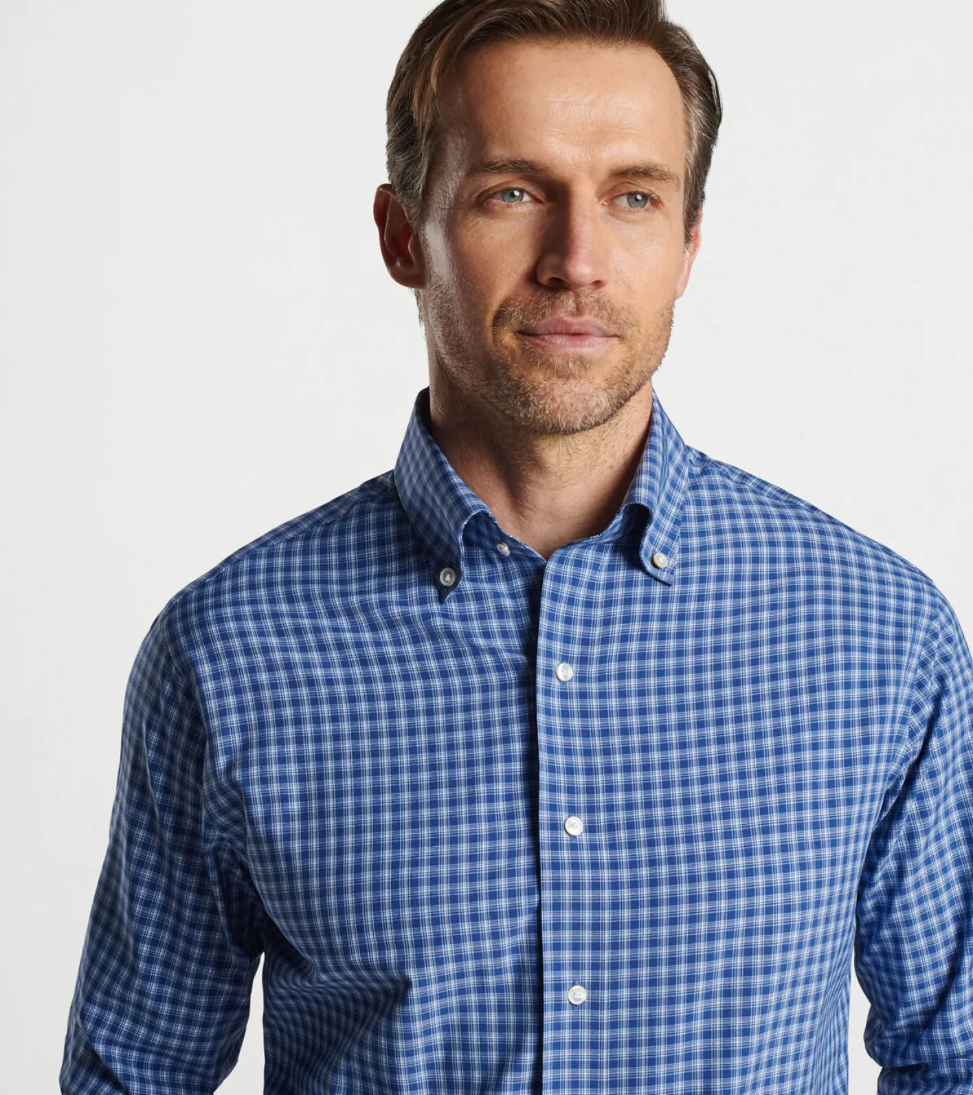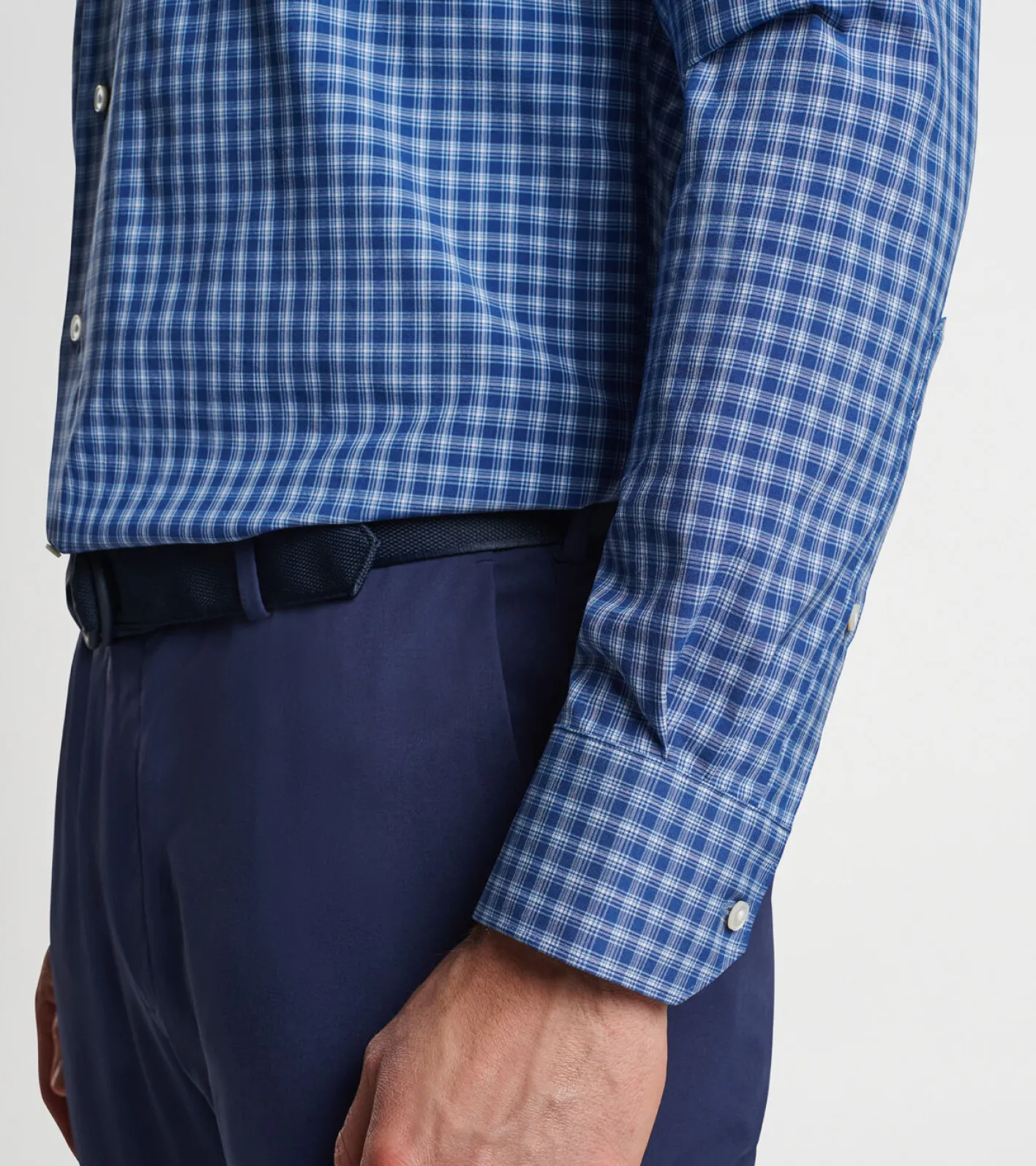 With the classic look of a poplin shirt in a sophisticated micro plaid, this design is crafted with a soft, dynamic and technical performance fabric. It features easy-care, two-way stretch, moisture-wicking and UPF 50+ sun protection. Finished with a button-down collar, French placket and mitered cuffs.