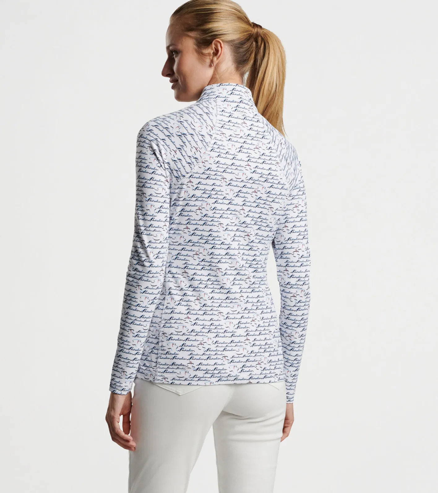 This lightweight base layer is made from our signature stretch jersey fabric to deliver enhanced comfort and ideal mobility whether you’re on the course or around town. The fabric offers four-way stretch, wicking, UPF 50+ sun protection and easy-care for optimal performance. This pullover features a custom-designed Birdie print for a unique touch of style. Finished with a mock collar and a quarter-zip closure with contrast piping.