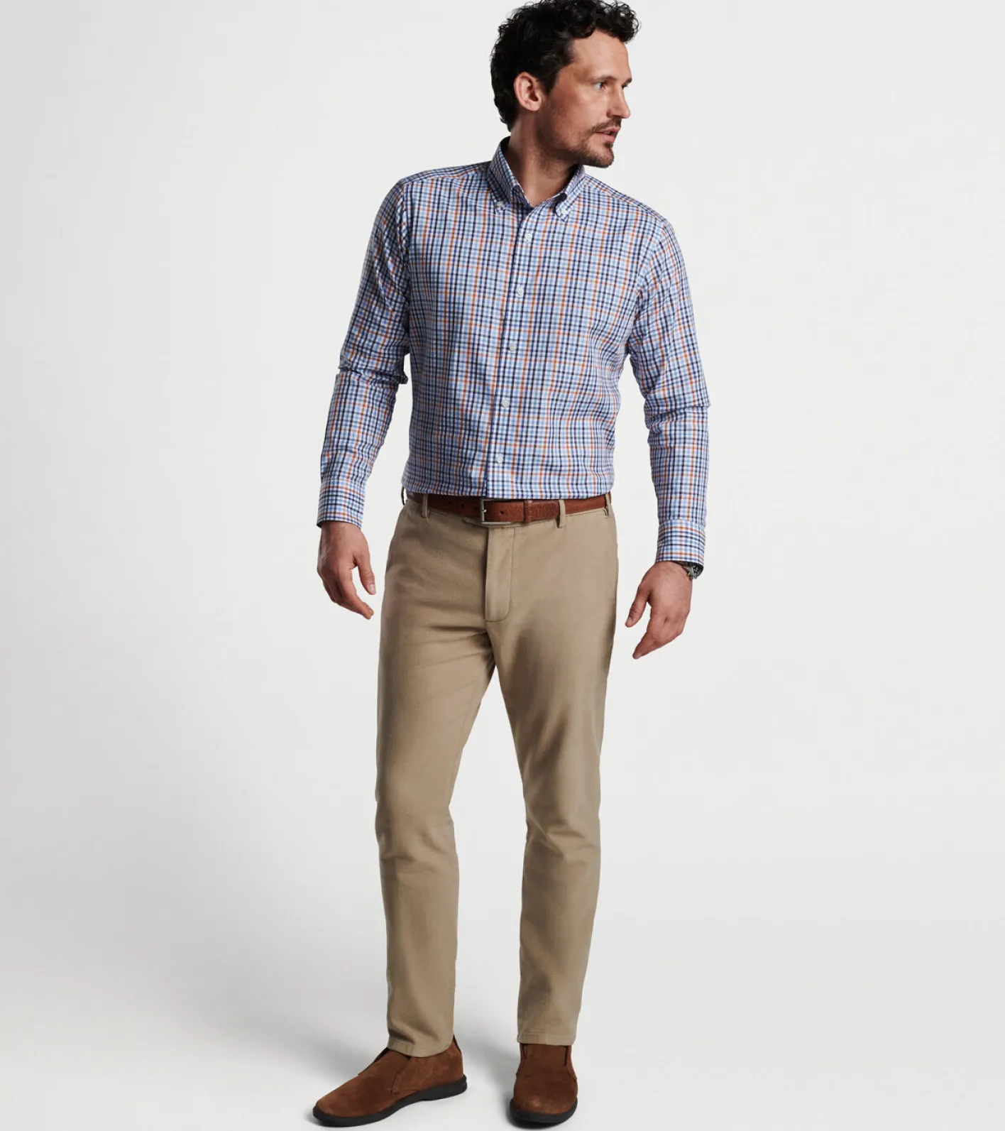 This sophisticated sport shirt is made from an incredibly soft cotton with our signature Flex Finish. This special treatment allows for incredible stretch mobility without the use of synthetic fibers. Finished with a button-down collar, French placket and mitered cuffs.
