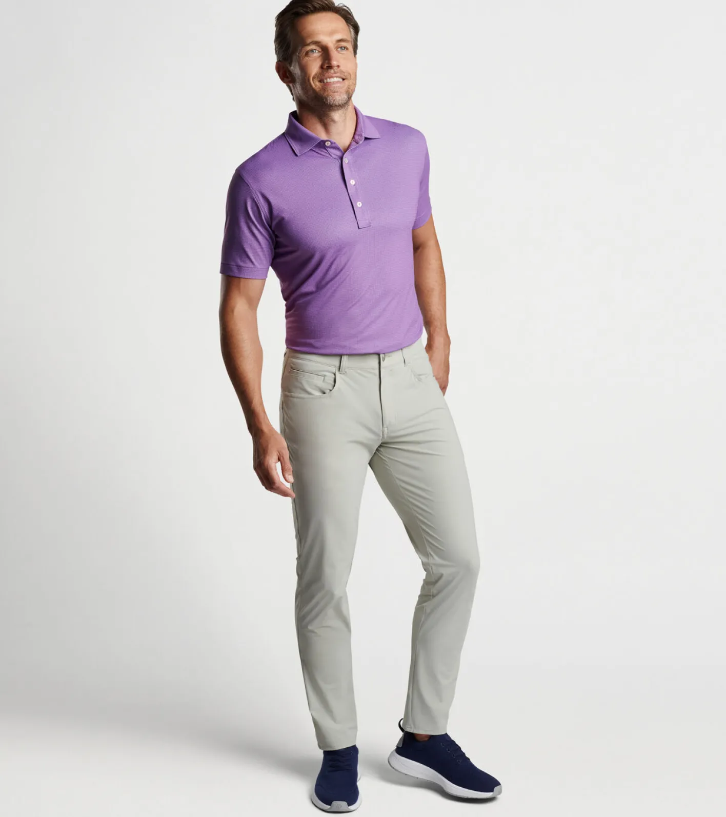 This polo captures a more subtle side of performance with a soft, elevated fabrication that offers wicking, four-way stretch, easy-care and UPF 50+ sun protection. Finished with a Kelly hard collar, a four-button placket and mother-of-pearl buttons.