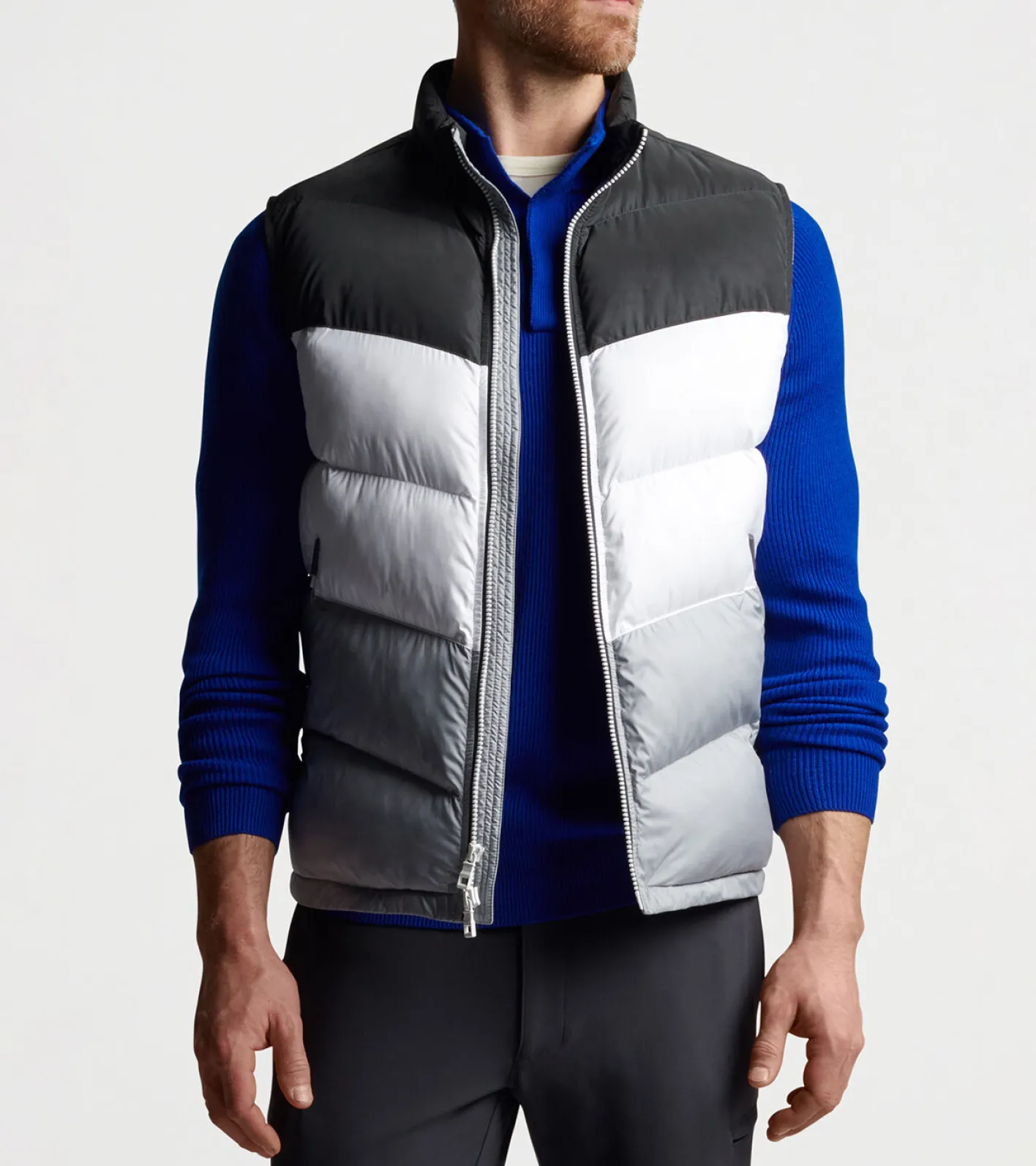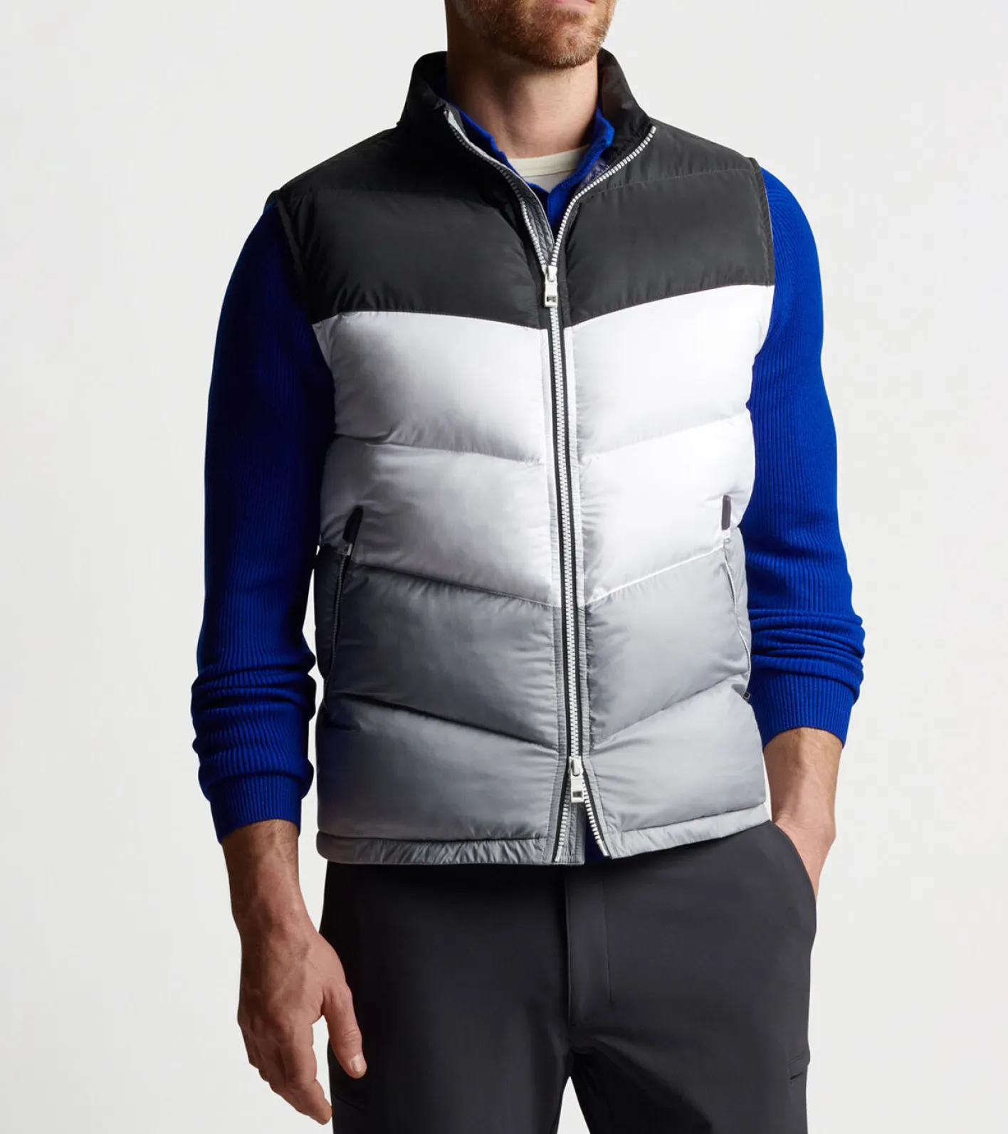 The anchor piece of our Après-Ski collection, this vest puts a modern spin on the color blocking designs of vintage après-ski apparel. The upper chest and back yoke feature a revolutionary microfiber coated with microscopic glass spheres for a smooth, highly-reflective finish. 100G blown insulation provides exceptional warmth without weight. Finished with white contrast zippers and custom-molded zipper garages.